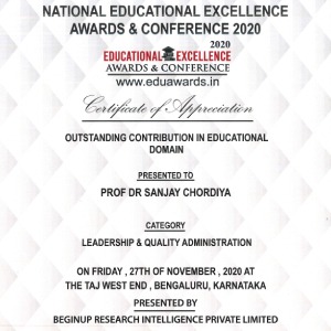 Professor Dr. Sanjay B Chordiya awarded with the Outstanding Contribution In Educational Domain under the category "Leadership & Quality Administration" and Certificate of Appreciation also given in National Education Excellence Awards & Conference 2020. This program was organized by Beginup Research Intelligence Private Limited on 27th Nov 2020 at The Taj West End, Bengaluru, Karnataka.