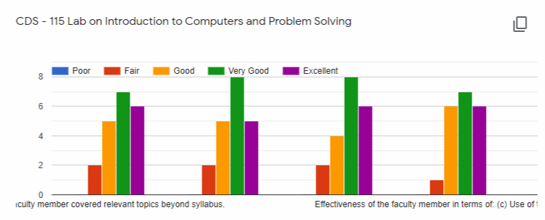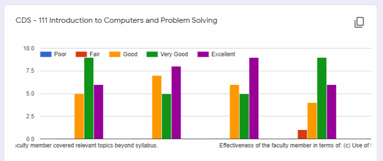 | 18 | 6/9/2021 17:21:09 | Prathamesh Dabir | Good | Fair | Very Good | Very Good | Very Good | Very Good | Fair | Fair |